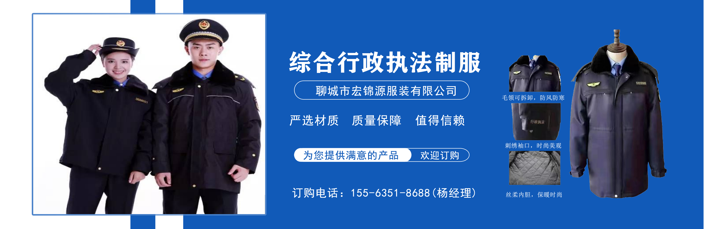 聊城市宏錦源服裝有限公司位于江北水城—山東聊城,地理位置優(yōu)越,交通便利。公司主營(yíng)綜合行政執(zhí)法制服,交通執(zhí)法服裝,應(yīng)急管理執(zhí)法標(biāo)志服,市場(chǎng)監(jiān)督管理標(biāo)志服,農(nóng)業(yè)執(zhí)法服裝,生態(tài)環(huán)境保護(hù)制服,文化市場(chǎng)執(zhí)法服,城管標(biāo)志服裝廠,衛(wèi)生監(jiān)督制服,六部門(mén)標(biāo)志服廠家等,值得信賴! 公司生產(chǎn)的標(biāo)志服裝據(jù)有造型美、板型新、多次水洗不退色、不變型、不起泡?! 罢J(rèn)真辦事,踏實(shí)做人”是宏錦源的企業(yè)精神,我們的宗旨是:“用服務(wù)與真誠(chéng)來(lái)?yè)Q取你的信任與支持,互惠互利,共創(chuàng)雙贏!”我公司愿與國(guó)內(nèi)外各界同仁志士竭誠(chéng)合作,共創(chuàng)未來(lái)企業(yè)目標(biāo):在已選定的服飾領(lǐng)域中,成為行業(yè)的卓越者?! 〗?jīng)營(yíng)理念:追求產(chǎn)品卓越,為用戶提供完美、高效的服務(wù)。...